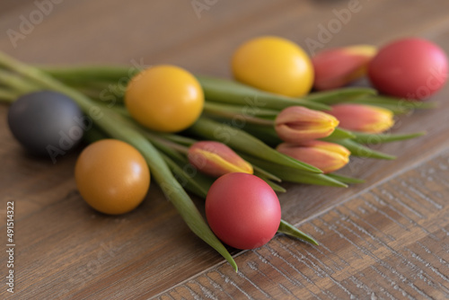 easter, egg, food, holiday, postcard, religion, congratulation, holy, table, celebration, spring, gift, painted, healthy eating, beautiful, texture, yellow, brown, natural, homemade, jesus christ, surprise, flower, tulip, green, colourful, bud, gold, bright, red, grey, mood