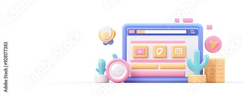 Colorful 3D illustration of a computer screen displaying a website, surrounded by decorative elements and plants.