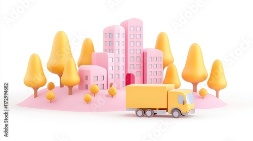 Colorful 3D Illustration of a Truck near a Playful City Landscape with Trees