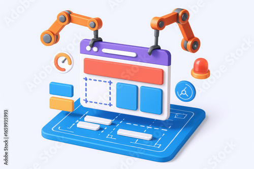 Colorful 3D illustration of robotic arms assembling a digital interface on a blueprint-style background.