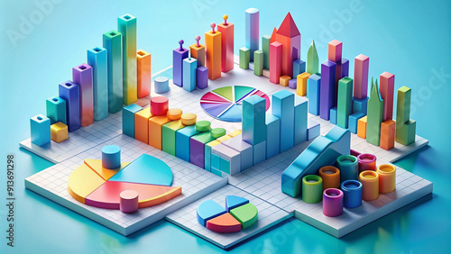 Colorful 3D infographics elements stacked in a modern composition, featuring charts, graphs, and icons, showcasing data visualization and information design concepts.