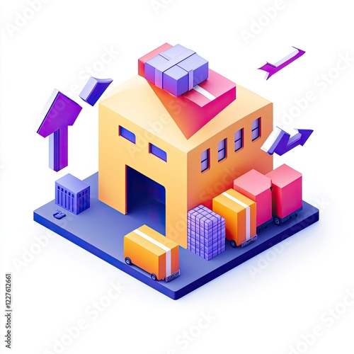 Colorful 3D Warehouse Illustration with Delivery Trucks and Packages in a Modern Style