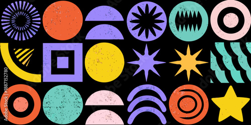 Colorful abstract geometric shapes and patterns arranged on a dark background