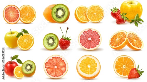 Colorful Arrangement of Fresh Sliced Fruits Including Oranges, Kiwis, Apples and Strawberries