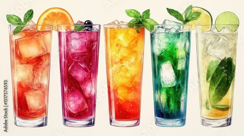 Colorful assorted refreshing cocktails with fruits and ice in tall glasses