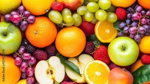 Colorful assortment of fresh fruits, vibrant apples, oranges, grapes, and lemons, ideal for healthy lifestyle themes.