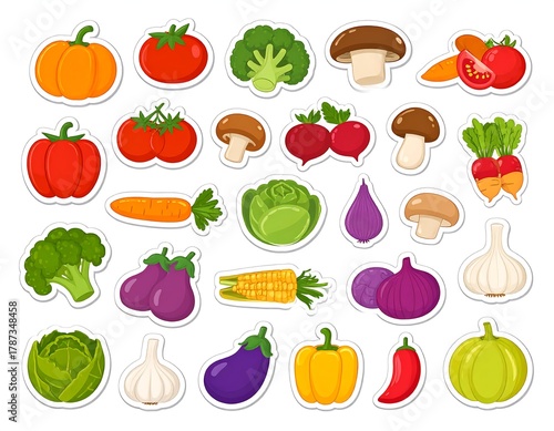 pumpkin, tomatoes, broccoli, mushroom, carrot, beet, cabbage, onion, garlic, aubergine, corn, pepper, radish, vegetarian, healthy, food, organic, sticker, collection, nourishment
