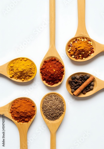 Colorful Assortment of Spices in Wooden Spoons — Flat Lay on White Surface