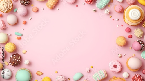 Colorful Assortment of Sweet Treats on Pink Background with Empty Space for Text or Design Elements