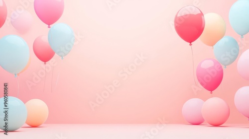 Colorful balloons floating in a pastel pink background, perfect for celebration and festive themes.