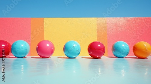 Colorful balls roll on bright floor, summer backdrop.