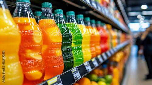 Colorful beverage bottles on a supermarket shelf. Drinks come in an assortment of colors, neatly arranged. On a retail shelf, beverages offer fresh options, ready for consumer choice.