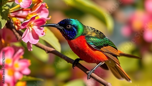 bird, flower, nature, wildlife, animal, colourful, vibrant, beautiful, exotic, tropical, spring, summer, blossom, fauna, flora, avian, nectar, beak, plumage, feather, wing, tail, perch, tree branch, green, red, blue, orange, yellow, pink, sunlight, garden, closeup, macro, detail, bright