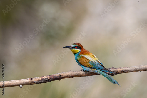 Colorful bird outdoors and wildlife. European bee-eater (Merops apiaster) in natural habitat. A strikingly beautiful colorful bird that can fly very well and winters in Africa as a migratory bird.