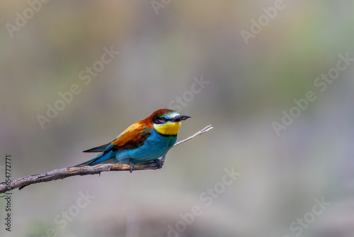 Colorful bird outdoors and wildlife. European bee-eater (Merops apiaster) in natural habitat. A strikingly beautiful colorful bird that can fly very well and winters in Africa as a migratory bird.