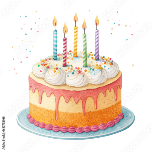 Colorful birthday cake with five lit candles, topped with whipped cream and sprinkles, radiates joy and celebration