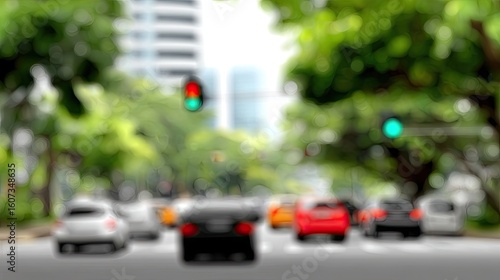 Colorful bokeh effect captures traffic lights and cars on a city street at dusk, creating an abstract urban landscape for design purposes