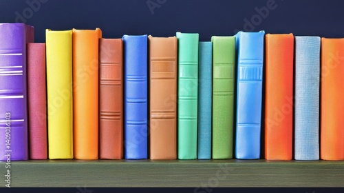 book, shelf, colourful, rainbow, literature, reading, cognition, education, library, study, learning, wisdom, novel, story, page, textbook, collection, volume, stack, row, arrangement, organised, background, dark, wall, display, design, interior, home, office, school, culture, information, research, bookshelf