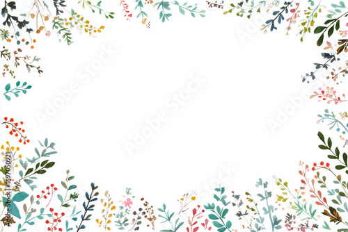 Colorful botanical illustration featuring various leaves and flowers arranged around a blank space for creative use