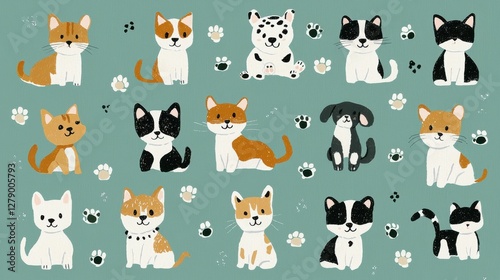 Colorful Cartoon Cats and Dogs with Paw Prints on Turquoise Background