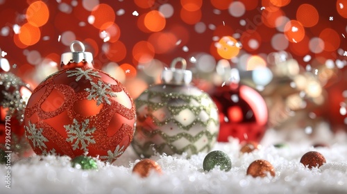 Colorful christmas toys and snowflakes on bright background, festive greeting card template