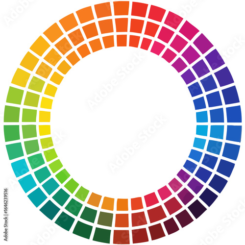 Colorful circular mosaic pattern with gradient spectrum from yellow to blue, green, red, and purple. Modern abstract design for art, technology, or creative branding.