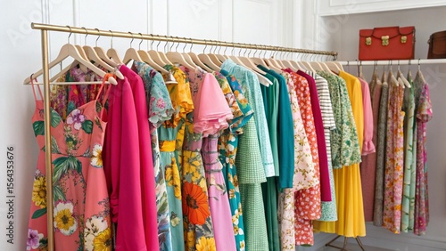 Colorful clothes and t-shirts hang on racks and hangers in a shop, a vibrant fashion display ready for sale