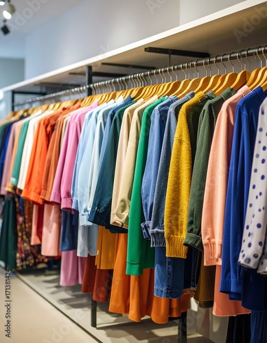 clothes, rack, store, colourful, fashion, display, retail, apparel, hanging, top, dress, skirt, shelf, light, modern, organised, bright, variety, clothing, interior
