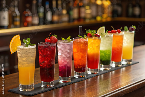 Colorful Cocktails on Wooden Bar – Vibrant Drink Display with Warm Lighting and Fresh Garnishes