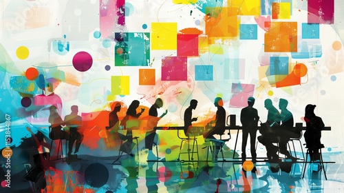 workspace, collaboration, colourful, space, expressive, oneness, diverse, visual, interaction, engagement, networking, feedback, performance, planning, vision, leadership, discussion, idea, brainstorming, motivation, inspiration, innovation, dynamic, meeting, strategy, layout, perspective, process, community, team, vibrant, analysis, emotion, development, connection, working, life events, participation, synergy, objective, challenge, communication, art, modern, abstract, concept, design, creative, environment