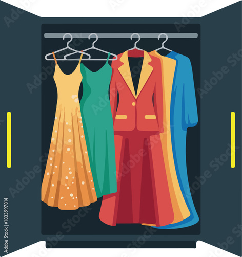 Colorful collection of dresses and a suit hanging on hangers inside an open wardrobe vector illustration
