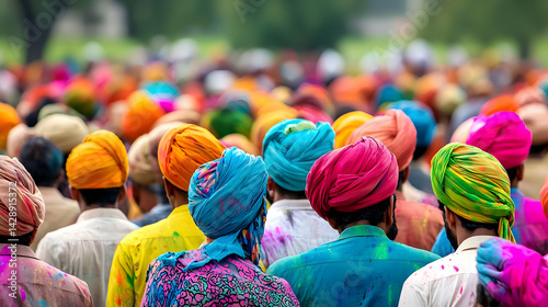 festival, crowd, people, celebration, colours, turban, colourful, indian, tradition, culture, holiday, holi, bright, many-coloured, man, back, celebrate, brightly, gathering