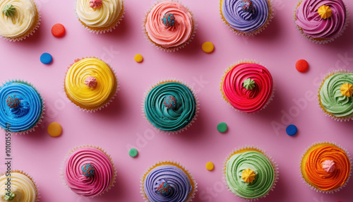 Colorful cupcakes with swirled frosting and sprinkles arranged on a vibrant pink background, creating a cheerful and festive mood.