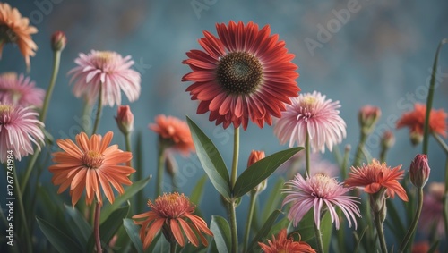Colorful daisies in various shades of pink and red against a soft blue background with vibrant green leaves Copy Space
