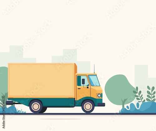Colorful Delivery Truck Illustration in Urban Setting with Greenery – Perfect for Logistics and Shipping Themes