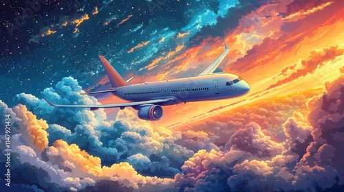 Colorful Depiction of an Airplane in Flight Above the Clouds