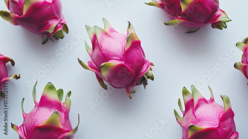 Colorful dragon fruits arranged on a white surface, showcasing their vibrant pink skin and green tips.