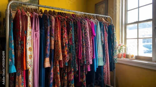 clothing, fashion, textile, bright, colourful, dress, rack, vibrant, floral, pattern, interior, cosy, sunlight, decoration, window, hanger, vintage, boutique, fabric, style, retail, shopping, display, design, home, warmth, femininity, creativity, cheerful, elegant, artisan, casual attire, atmosphere, beauty, pattern, accessory, textile, ambience, clothes rack, leisure, visual, variety, arrangement, indoor, decor, customization, cultural, harmony