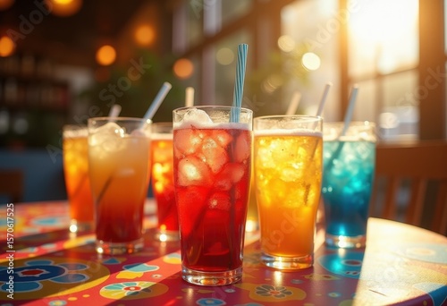 colorful drink cups vibrant table setting filled happiness joyous celebration, furniture, ceramic, glass, beverage, refreshment, tableware, party