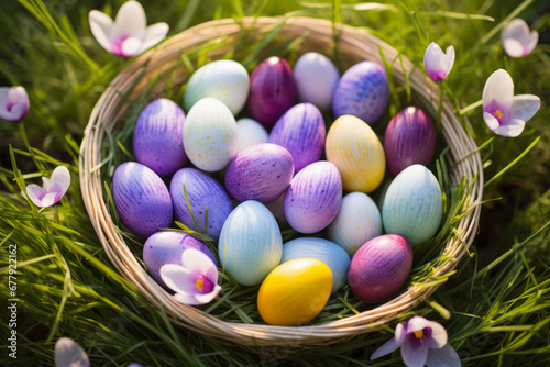 Colorful Easter eggs in a basket on a grass. Celebrating Easter outdoors.