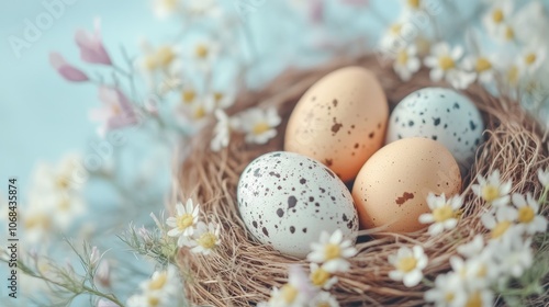 Colorful Easter eggs in a nest surrounded by delicate flowers on a spring morning
