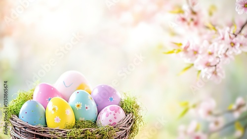 Colorful Easter eggs in spring grass with pastel flowers, embodying joy and renewal.