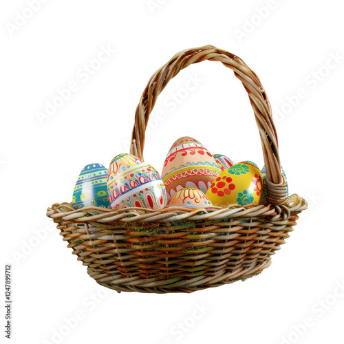 Colorful Easter eggs in woven basket, symbolizing spring and celebration. vibrant designs and patterns add festive touch to scene, perfect for holiday decorations