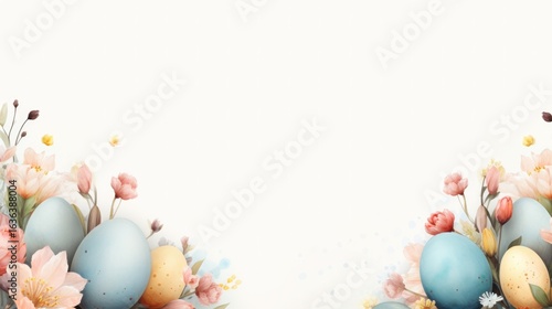 Colorful Easter eggs surrounded by delicate flowers and soft pastel hues create a festive atmosphere, perfect for spring celebrations and seasonal greetings with copy space