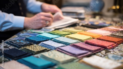 fabric, textile, swatch, colours, design, interior, decoration, upholstery, pattern, creativity, artistry, workspace, sample, selection, craft, hand-made, material, hand, inspiration, palette, tailoring, fashion, embellishment, home, style, concept, planning, styling, craftsmanship, visible, arrangement, colourful, choice, detail, layout, innovation, organisation, aesthetic, vision, surface