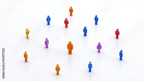 Colorful figures of people interconnected by lines create visual representation of teamwork, networking. Central figure stands out among many individuals leadership, connection. Illustration shows