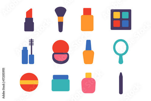 colourful, cosmetic, icon, make-up, lipstick, flat, brush, palette, beauty, skincare, mirror, mascara, powder, nail polish, lotion, container, stylish, design, feminine, fashion, vibrant, trendy, product, illustration, set, collection, artistic, creative, decorative, element, professional, modern, attractive, symmetric, aesthetic, diverse, cute, essential