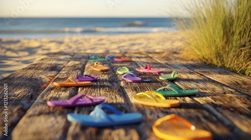Colorful flip-flops on a wooden boardwalk at the beach.