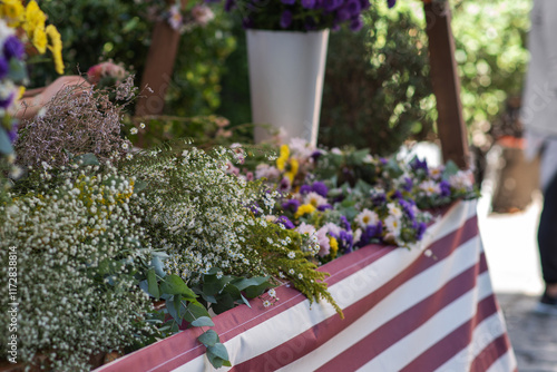 colorful floral arrangement with vibrant purple, yellow, and pink flowers, greenery, and delicate white blooms on a striped tablecloth, creating a natural and fresh display at an outdoor market