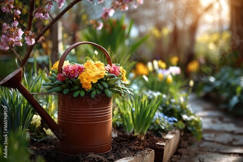 Colorful flowers in a watering can placed in a vibrant garden filled with blooming plants during golden hour sunlight